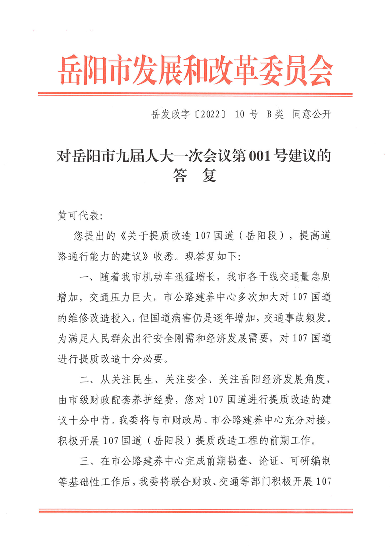 对岳阳市九届人大一次会议第001号建议的答复