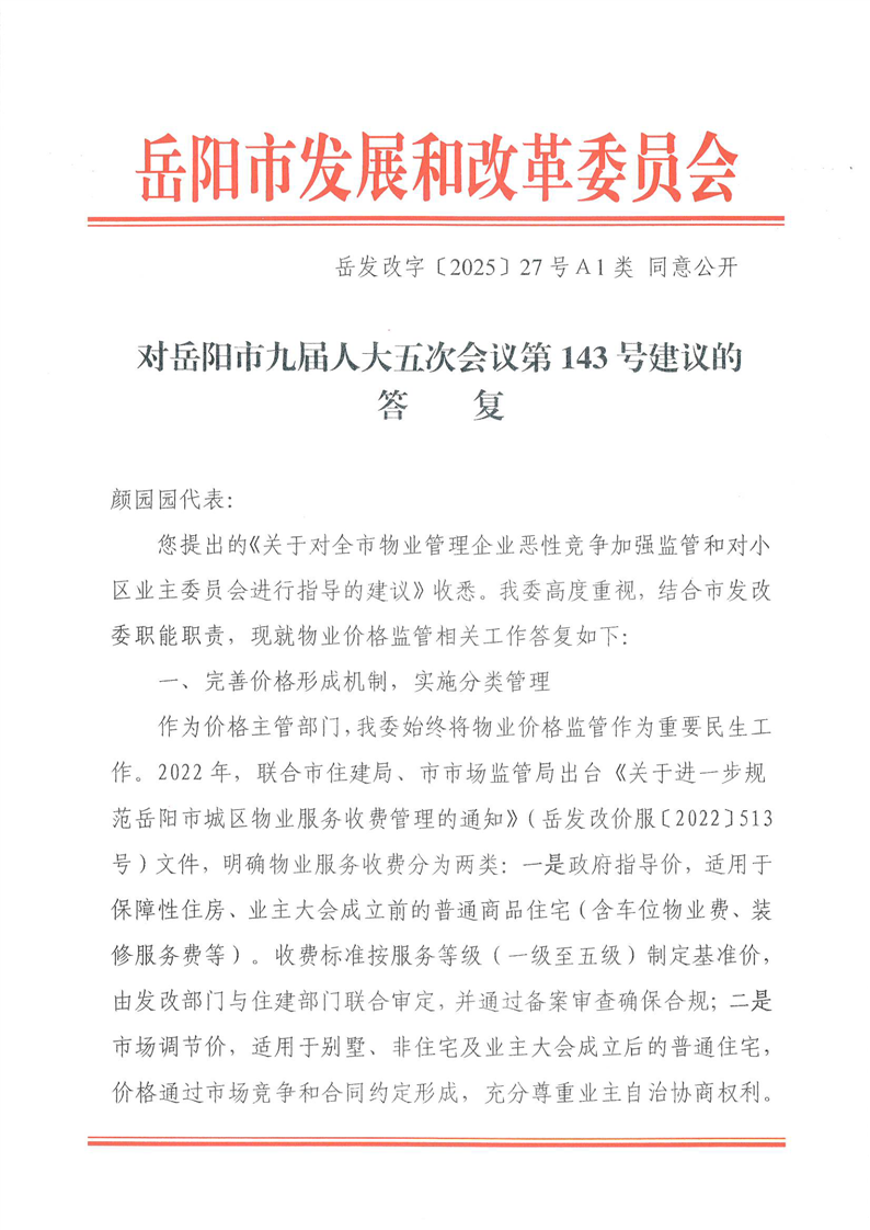 对岳阳市九届人大五次会议第143号建议的答复