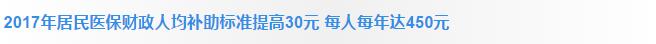 人社部、财政部近日发布《关于做好2017年城镇居民基本医疗保险工作的通知》,通知提出,2017年居民医保各级财政人均补助标准在2016年基础上新增30元,平均每人每年达到450元。此外,2017年城乡居民医保人均个人缴费标准在2016年基础上提高30元,平均每人每年达到180元。