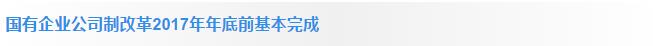 近日,国务院办公厅印发《关于进一步完善国有企业法人治理结构的指导意见》,部署加快推进中国特色国有企业现代企业制度建设。《意见》称,坚持深化改革、党的领导、依法治企、权责对等的基本原则,2017年年底前,国有企业公司制改革基本完成。