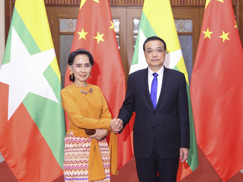 国务院总理李克强5月16日下午在人民大会堂会见来华出席“一带一路”国际合作高峰论坛的缅甸国务资政昂山素季。