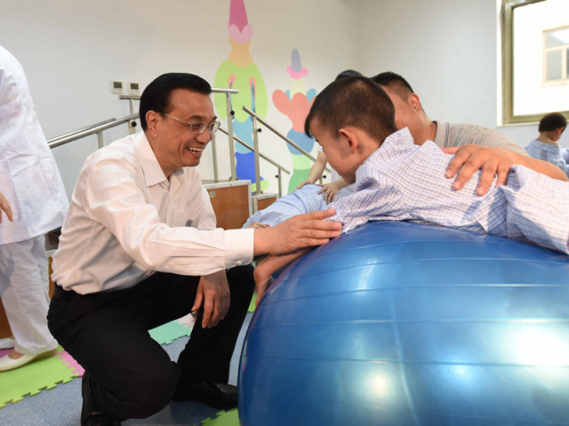 2014年5月30日,看望正在进行康复训练的孤残儿童时,李克强蹲下身,询问一个孩子的恢复情况。起身后,他再次蹲下身,帮助另一个孩子在健身球上做起了康复训练。
