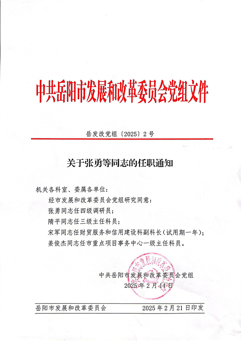 关于张勇等同志的任职通知