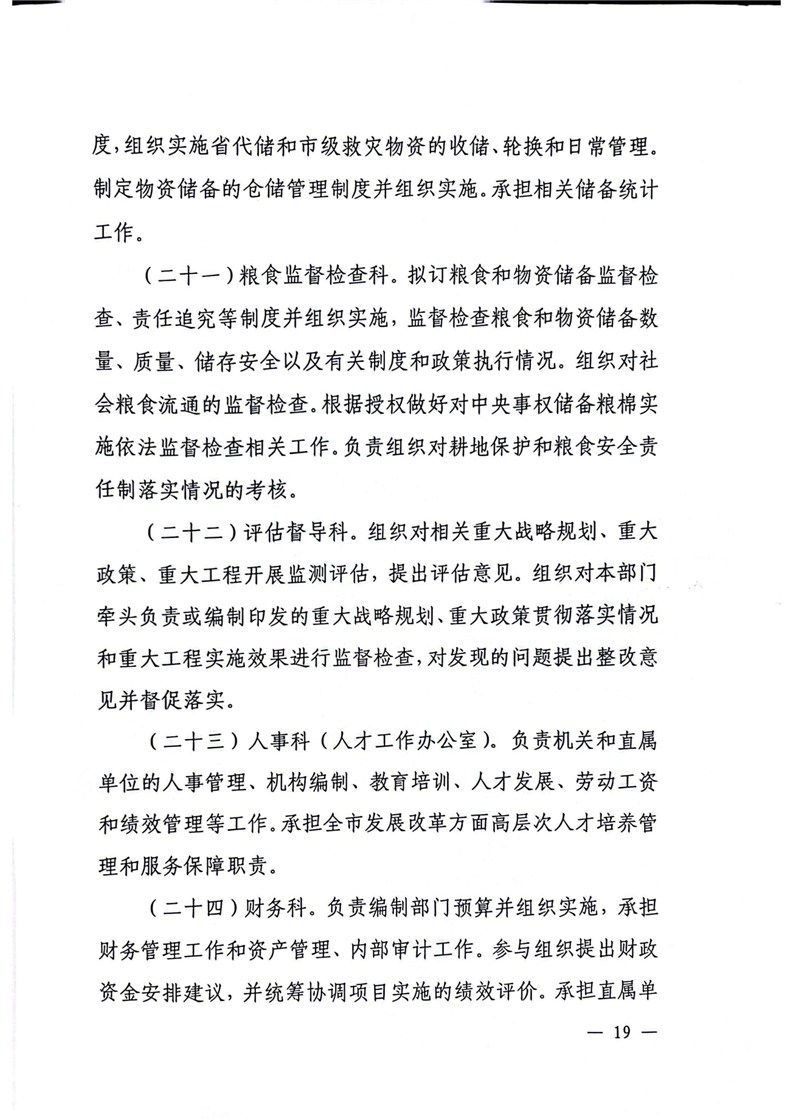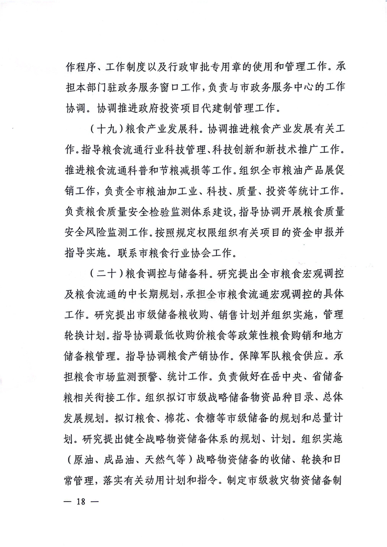 分管法规科、财贸科、粮食产业发展科、粮食调控和储备科、粮食监督检查科、军粮供应中心。