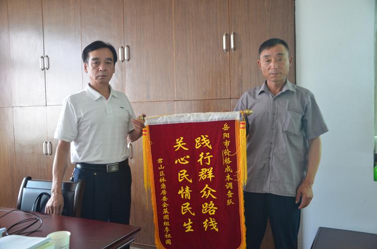 君山区林角居委会菜农李祖国等4户是市价格成本调查队的农产品成本调查登记户。6月20日,李祖国一行将一面写着“践行群众路线、关心民情民生”的鲜红锦旗送到市价格成本调查队,感谢市价格成本队对林角居委会菜农的真情帮助。