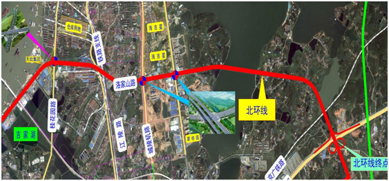 北环线洛家山路位于城陵矶新港区,西起沿湖大道桂花园码头,向东上跨桂花园路、江陵路、城陵矶支线铁路,沿规划的洛家山路上跨城陵矶路、联港路,再沿规划的芭蕉湖路上跨芭蕉湖,经天鹅岛,向东上跨京广铁路、G107,止于规划的灵感山路,本项目已于2017年12月26日开工建设。