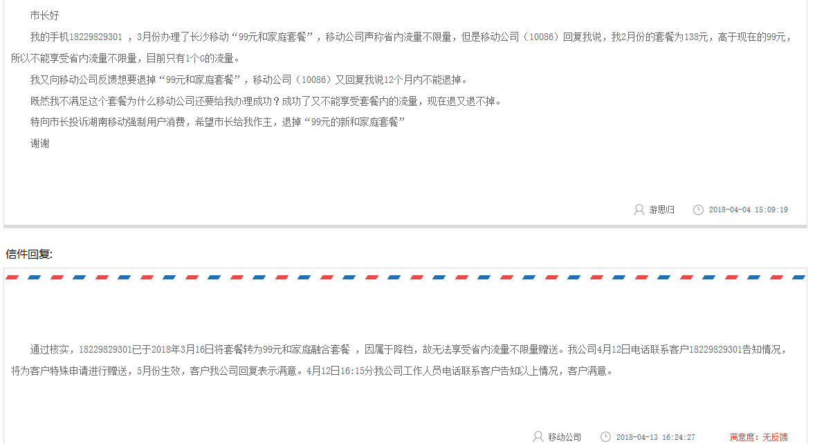 特向市长投诉湖南移动强制用户消费,希望市长给我作主,按相同的方式进行处理。