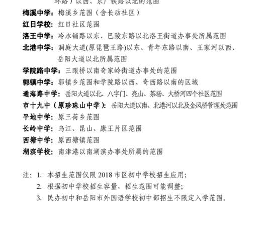 市区初中招生入学按照“免试入学、划片招生、相对就近”的原则执行。招生范围由市教育体育局协调三区(岳阳楼区、岳阳经济技术开发区、南湖新区)教育局根据初中学校服务区内的适龄学生的人数划定。
