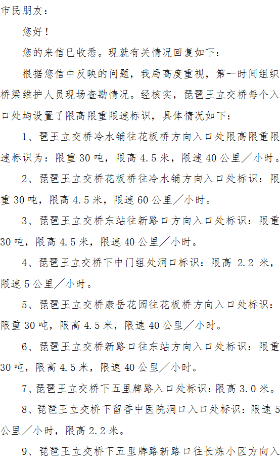 琵琶王立交桥建了20年了,为什么不限高限重?作为岳阳市的交通枢纽,每次看到大型货车在桥上像蜗牛爬,我就觉得会出问题,一旦出问题,要重新恢复,那可需要不少时间,岳阳市内出行肯定更加困难了。能不能在每个入口建一道限高限重的设施呢?这样的话,本来正常运行50年的桥将能运行80年、100年或更久,这样的设施应该花不了多少钱吧!