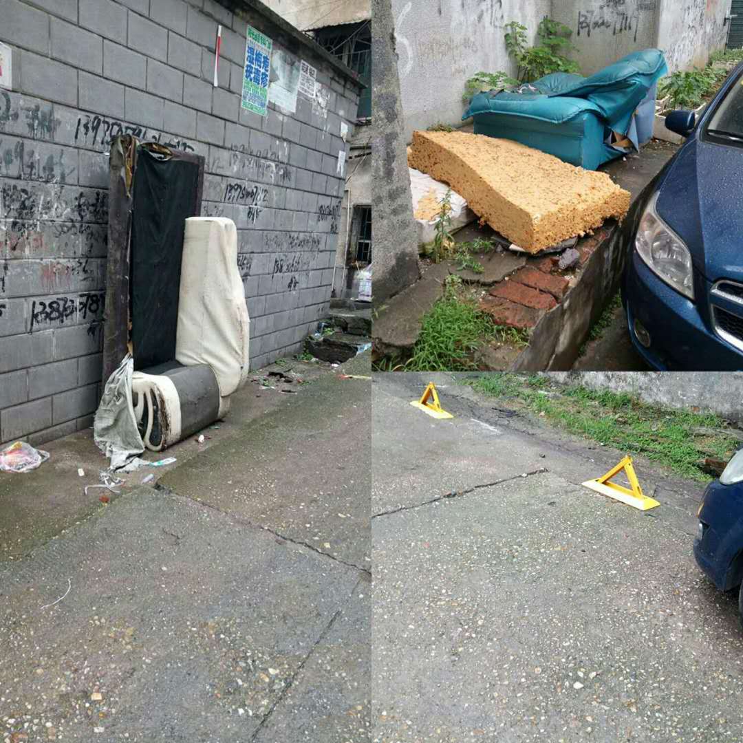 我们是枫树岭社区三网格167号的业主,我们要反映两个问题:1、我院子大门外有大门对面有两处沙发摆放很久,一直没有人管理,加上天气严热,已经滋生大量蚊蝇,卫生情况极差,清扫我这路段的环卫工人说这个不属于他们管。2、我们院外的路现已经被大量私车用户打了私人地钉,霸占了路面,严重堵塞消防通道也严重影响我们这车业主的车辆出行,这个问题我们已经多次打了12345市长热线投诉,但都无结果,社区说这个不属于他们管,对于我们老百姓来讲,真的是投诉无门,无人受理,恳请领导能尽快处理。谢谢!