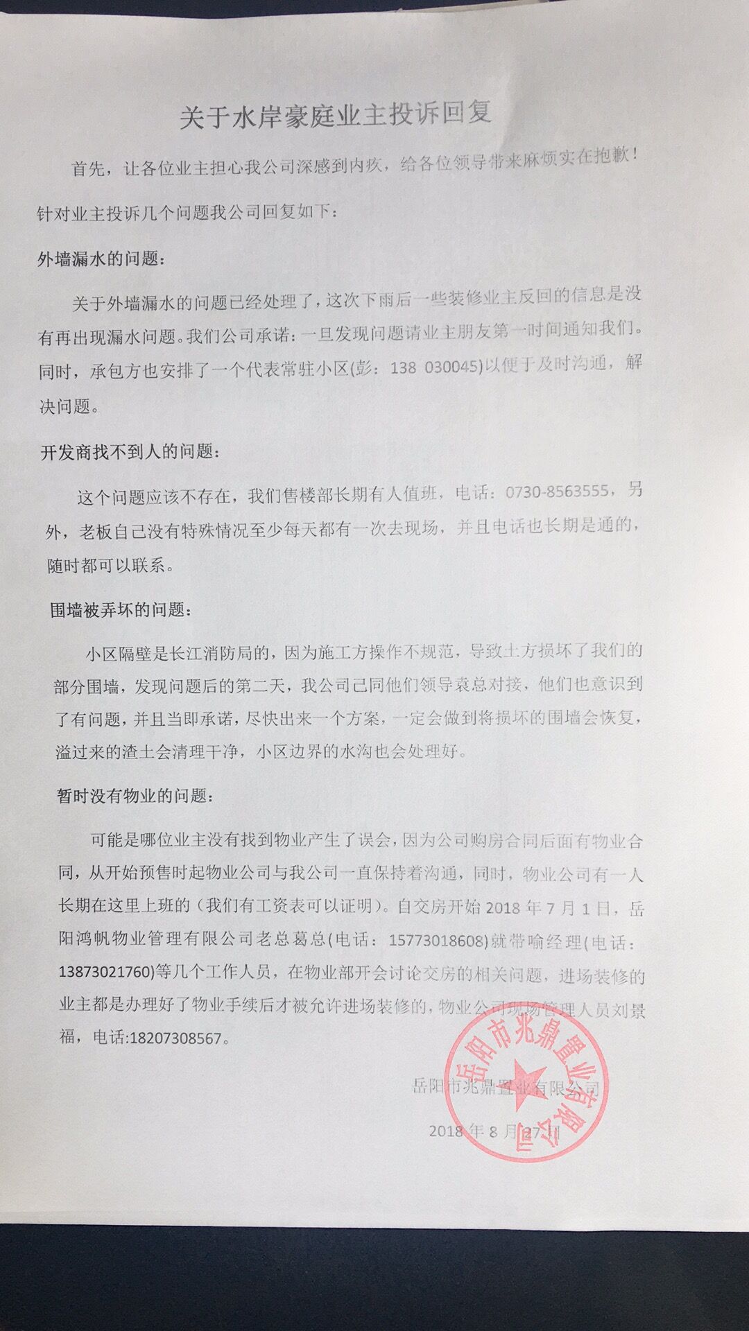 收到来信后,工作人员立即与该项目开发商岳阳市兆鼎置业有限公司负责人联系,要求开发商针对你们提出的问题认真核实处理。现将开发商的回复(见附件)转发给你们,如仍有疑问,可以再次与市住保中心云溪区分中心联系,联系电话:8412288.。