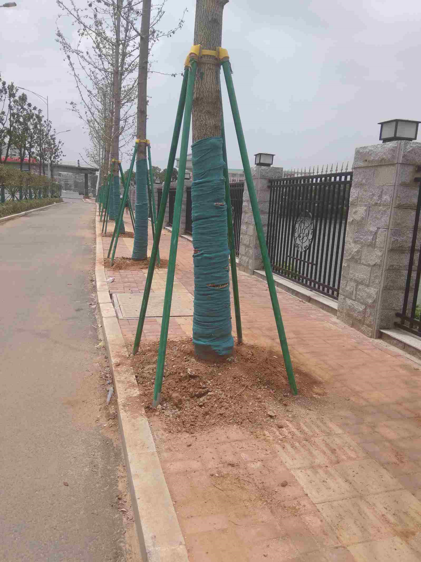 一、因设计调整,湘北大道理工学院南院处人行道变窄,导致树木栽种至人行道,为先铺设地砖后移植树木;