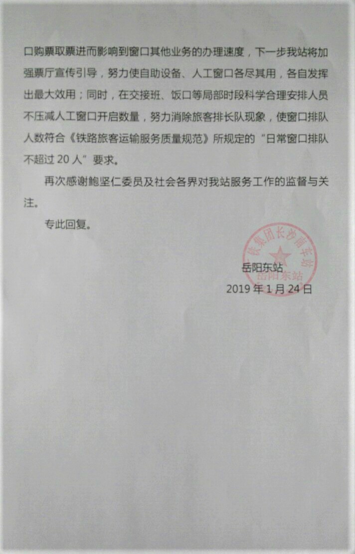 岳阳市政协委员鲍坚仁通过省政协云APP微建议反映:岳阳东站售票处的人工服务窗口很多,但是很多时候只打开一两个,其余窗口使用窗帘遮蔽(做的很隐蔽),导致排队过长,排队一小时并不罕见。现在春运马上开始了,而且天气寒冷,这个情况愈发严重。岳阳东站完全有条件多开人工窗口,希望队伍不超过十人。