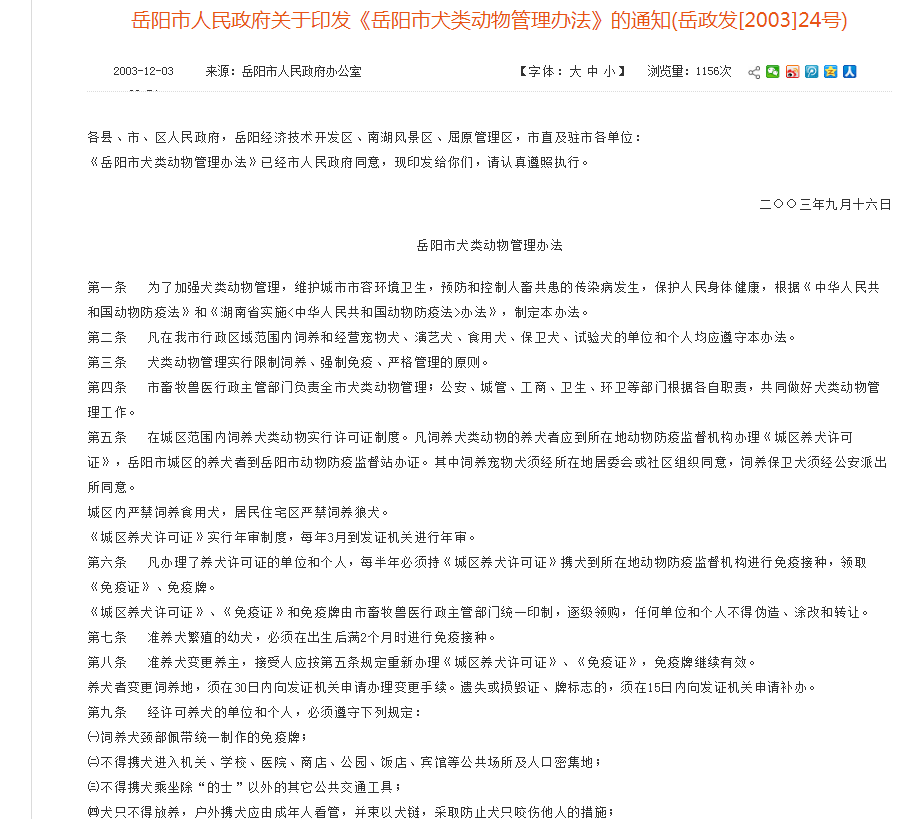 1.2003年岳阳市政府办公室下发的《岳阳市犬类动物管理办法》依据《岳阳市人民政府关于公布规范性文件清理结果的决定》(岳政发[2008]34号)已失效。