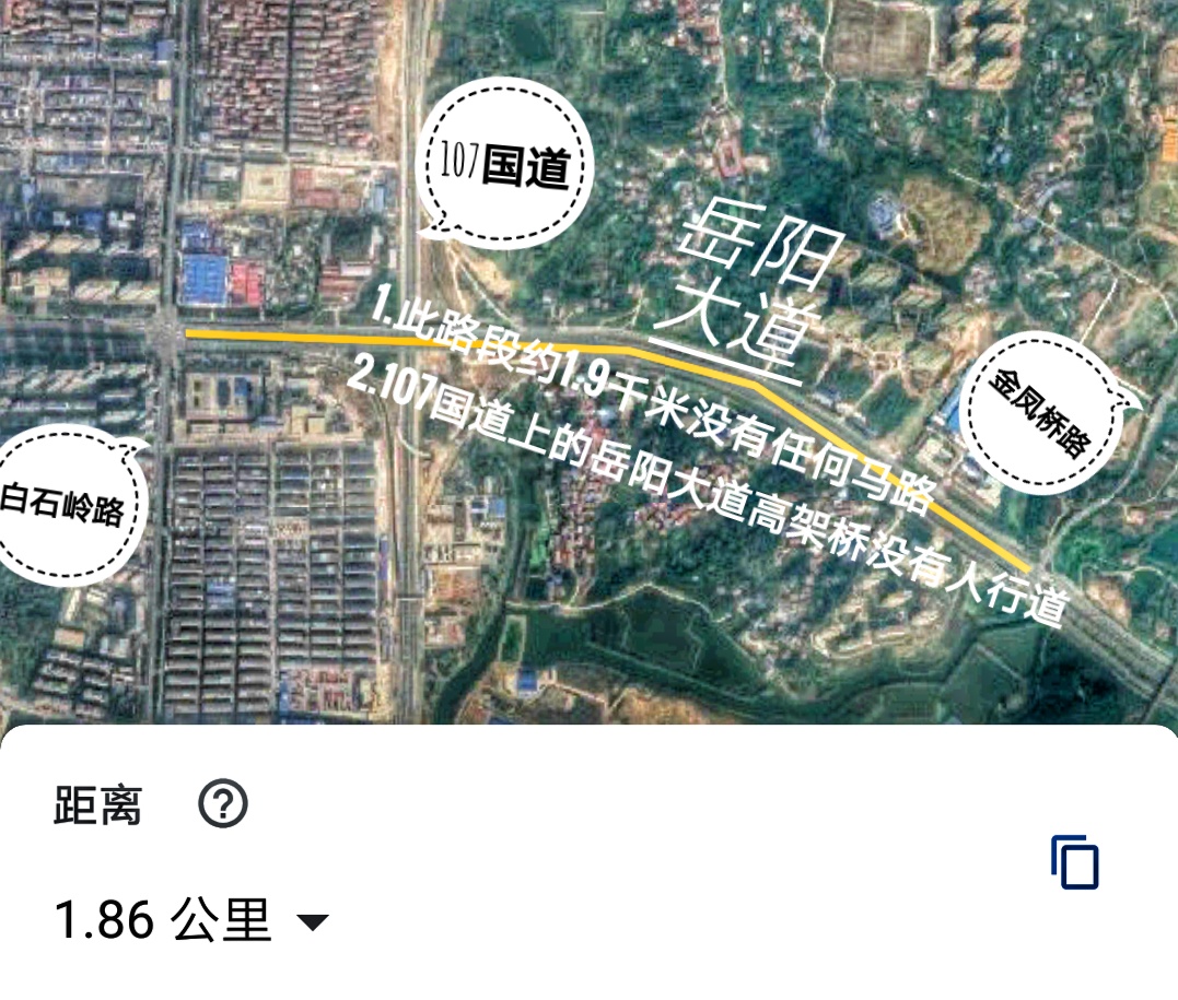 3.岳阳大道自白石岭路到金凤桥路(约1.9千米)之间没有任何的斑马线,沿线的居民出行安全隐患极大。岳阳大道车流量大,车速快,每天早晨常常看见许多小孩子横穿马路去上学,令人非常揪心!考虑到岳阳大道比较宽,建议在岳阳大道修建天桥或人行地下通道,为二侧居民与小孩的生命安全提供保障!
