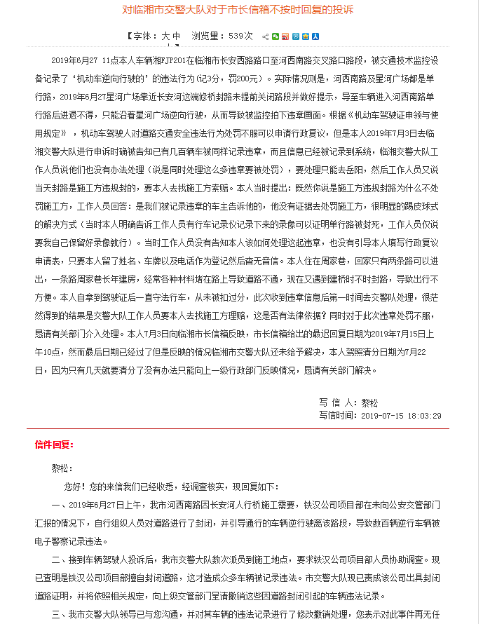 二、接到车辆驾驶人的相关投诉后,交警大队多次派员找到铁汉公司项目部负责人,要求其协助调查,查明情况后,交警大队迅速依照相关规定,向上级交管部门呈请撤销这些因道路封闭引起的车辆违法记录。目前,这些依照相关规定应予修改的违法记录已得到基本解决。