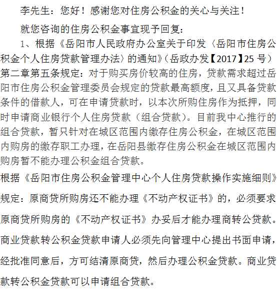 本人系岳阳县公积金,于一年前在岳阳市湖滨购入一套房产,因岳阳县住房公积金只能贷到35万,所以选着商业贷款,现听说岳阳市已可办理公积金+商业贷款的组合贷款,现想咨询1、岳阳县住房公积金能否办理公积金+商业贷款的组合贷款?2、已办理商业贷款的房子,能否转为公积金+商业贷款的组合贷款?谢谢
