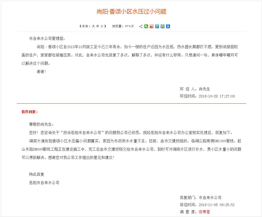 2018年11月,本人曾通过市长信箱咨询过“尚阳·香颂小区水压过小问题”,贵单位答复管道工程在施工,完工后水压问题会解决(详见附件)。可是近10个月过去了,现在小区水压依旧很小,请问作何解释?打算何时解决?谢谢。