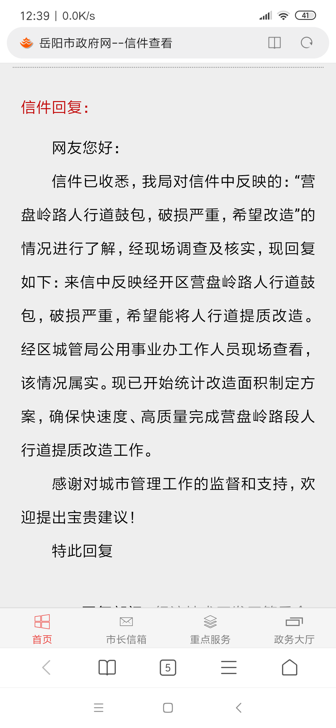 关于营盘岭路人行道问题破旧坑洼鼓包等反映已过半年时间,当时政府也派员查看属实并回复加快维修更换。那么半年过去了有没有具体的动工时间,请把人行道修一修解决周边几千户居民出行问题。