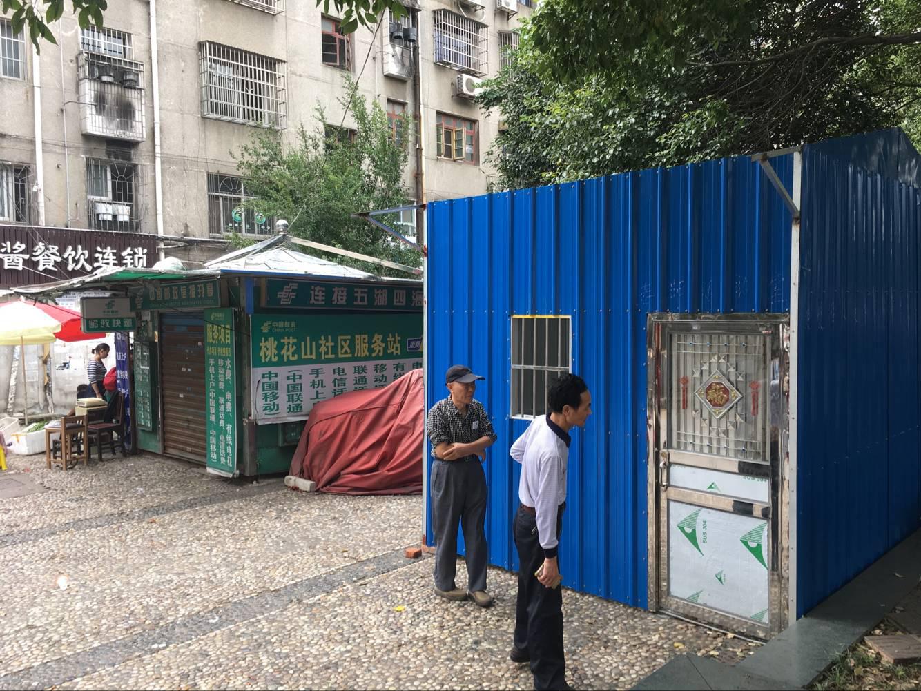 2017年10月7日星期六早晨,在民乐苑路与岳阳大道交汇处的小花园东南角,有人用瓦楞钢搭建一座临时小屋。
